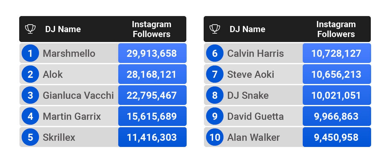 With just short of 30 million Instagram followers, Marshmello is the most popular DJ on the social media platform. His star-studded collaborations have no doubt garnered him an impressive following and his regular content featuring his signature marshmallow-like headgear has helped him to continue to build that following.