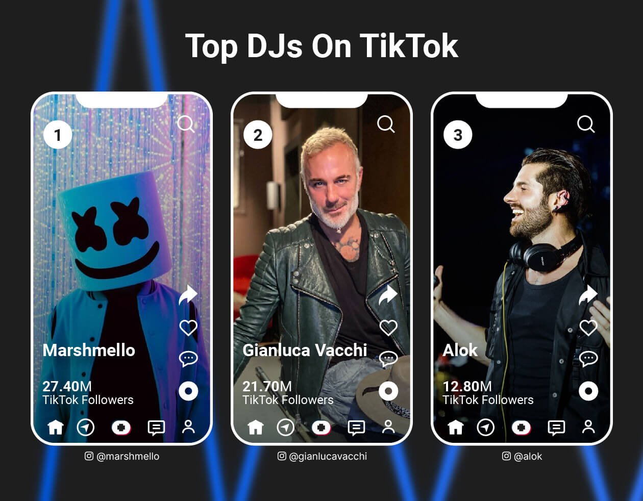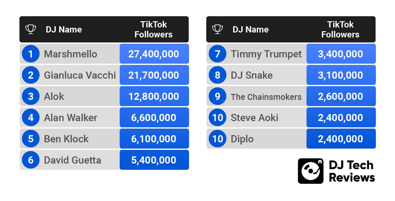 The total number of Instagram and TikTok followers was found on each DJ’s page.