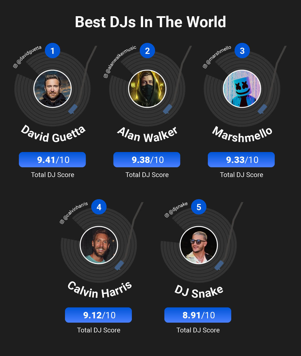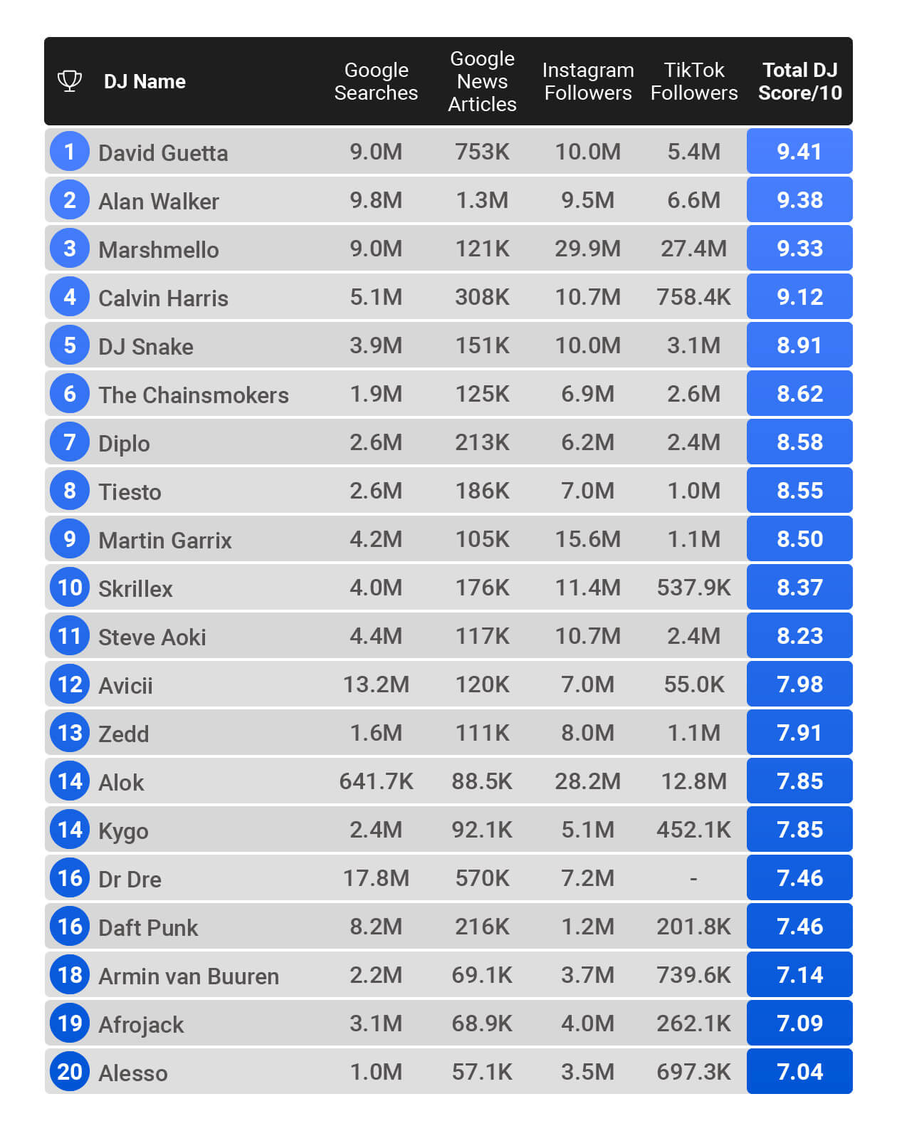 By taking a deep dive into the data surrounding the most popular DJs’ song successes, social media followings, and Google searches we are able to reveal the world’s most influential DJs.