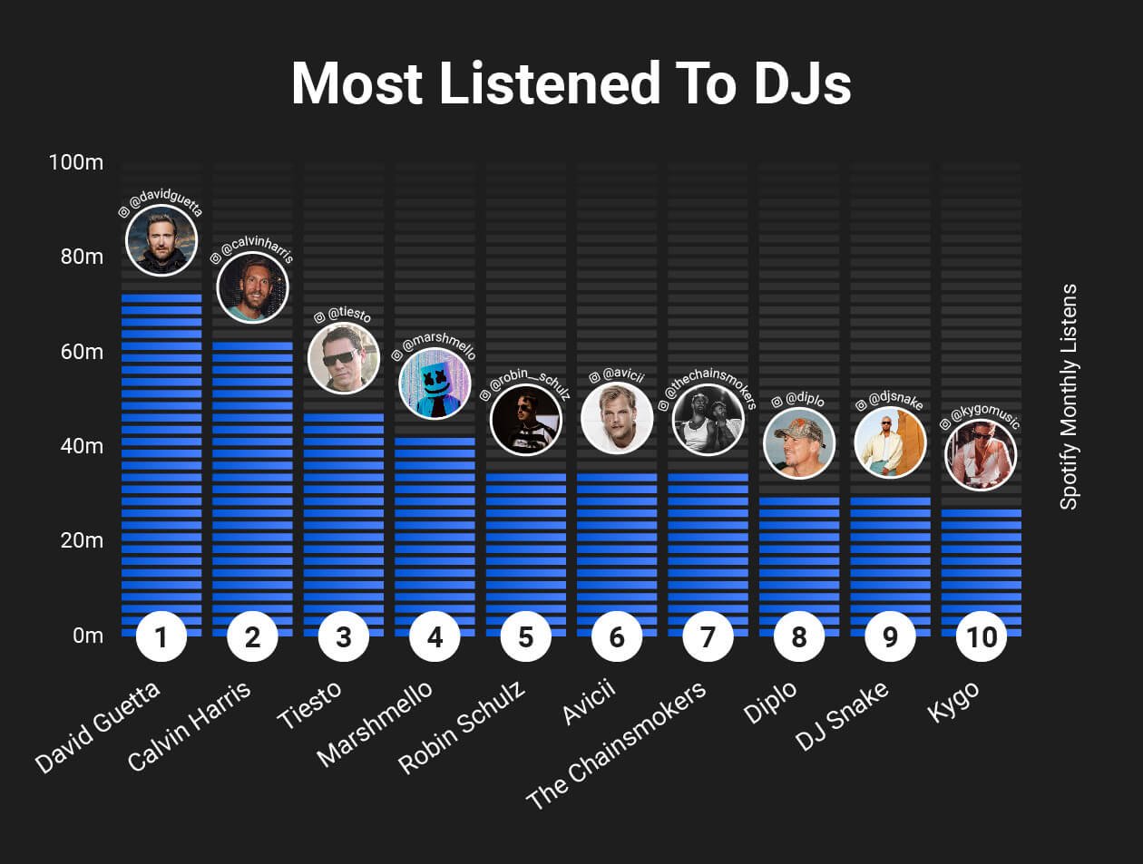 A list of the most prominent DJs around the world was created from various articles including DJ Mag and Zillion FM. We then cut down this list of over 200 DJs by taking only the 100 with the highest number of Instagram followers.