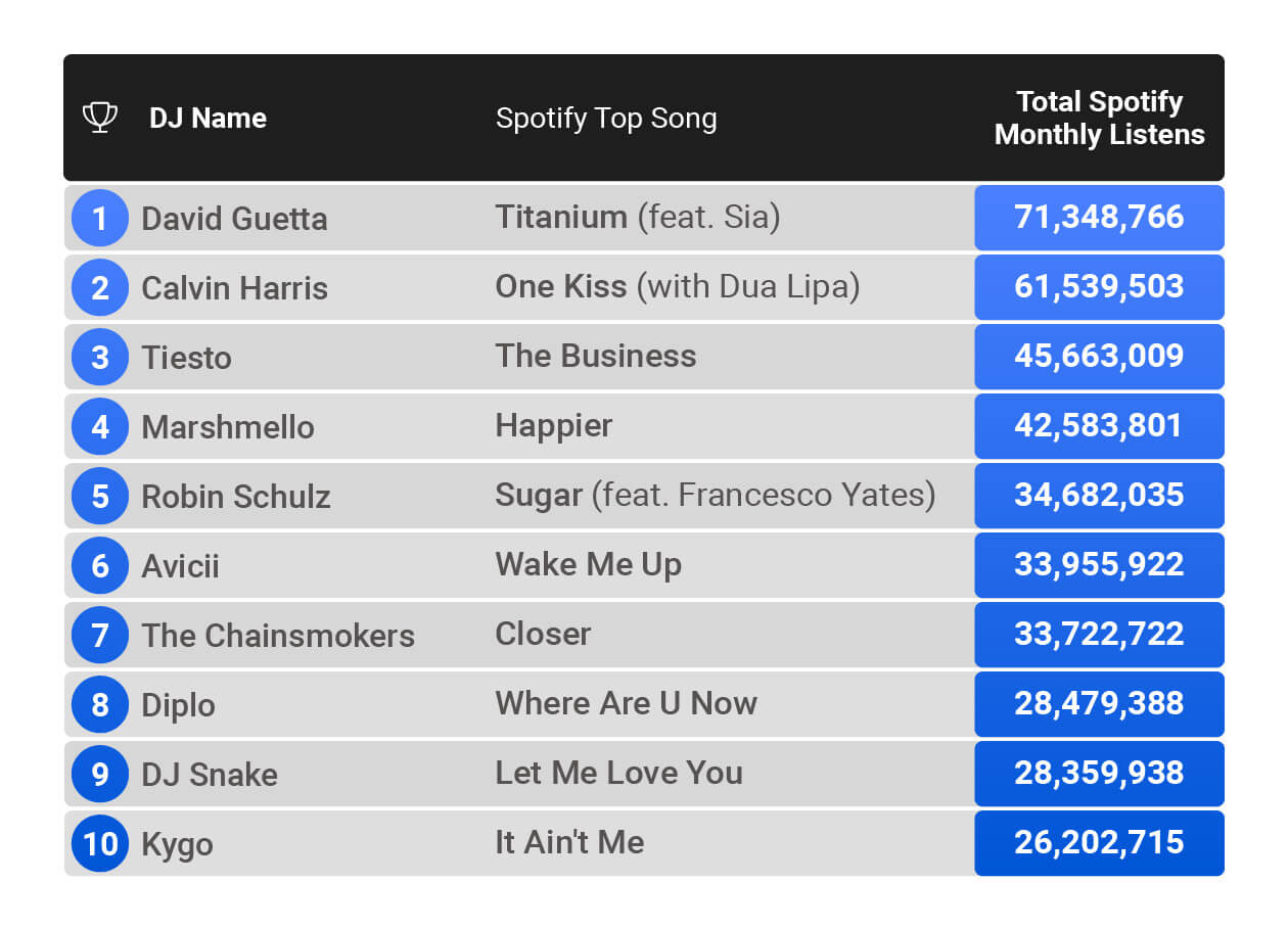 The only other DJ to have over 60 million average monthly listeners is Calvin Harris. Harris has four songs with over 1 billion plays on Spotify, these are: ‘One Kiss’, ‘Summer’, ‘This is What You Came For’, and ‘We Found Love’. Harris is also known for his many collaborations, with hit-makers such as Rihanna, Dua Lipa, and Ne-Yo, earning him global success.